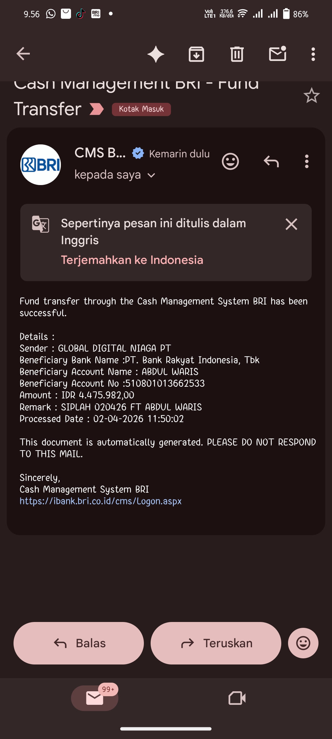 | 62 | 04-04-2026 | Transport Pak Bahar ke semarang | - | Rp 5.000.000 | Rp 433.490 | - |