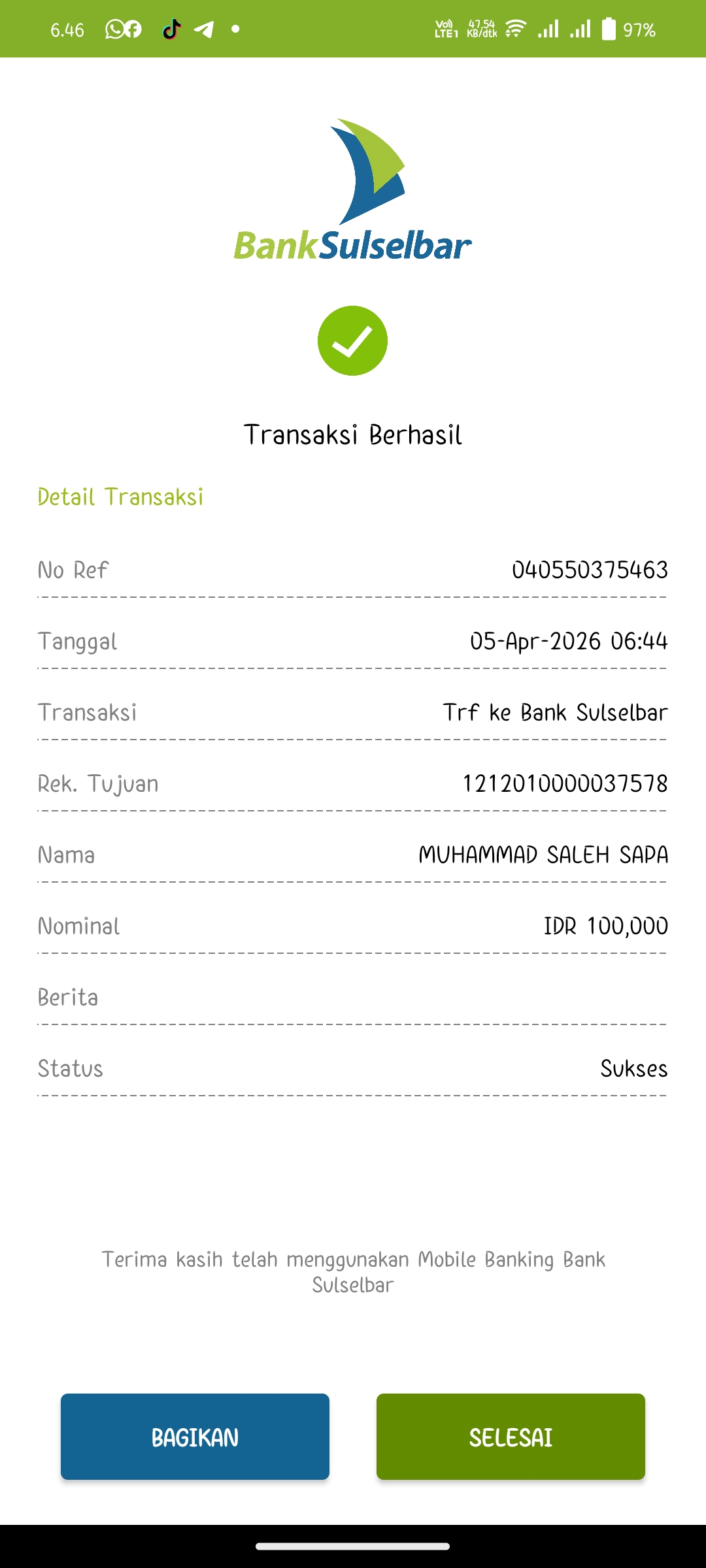 | 64 | 05-04-2026 | Pembayaran Kontribusi Hut Enrekang | - | Rp 100.000 | Rp 233.490 | |