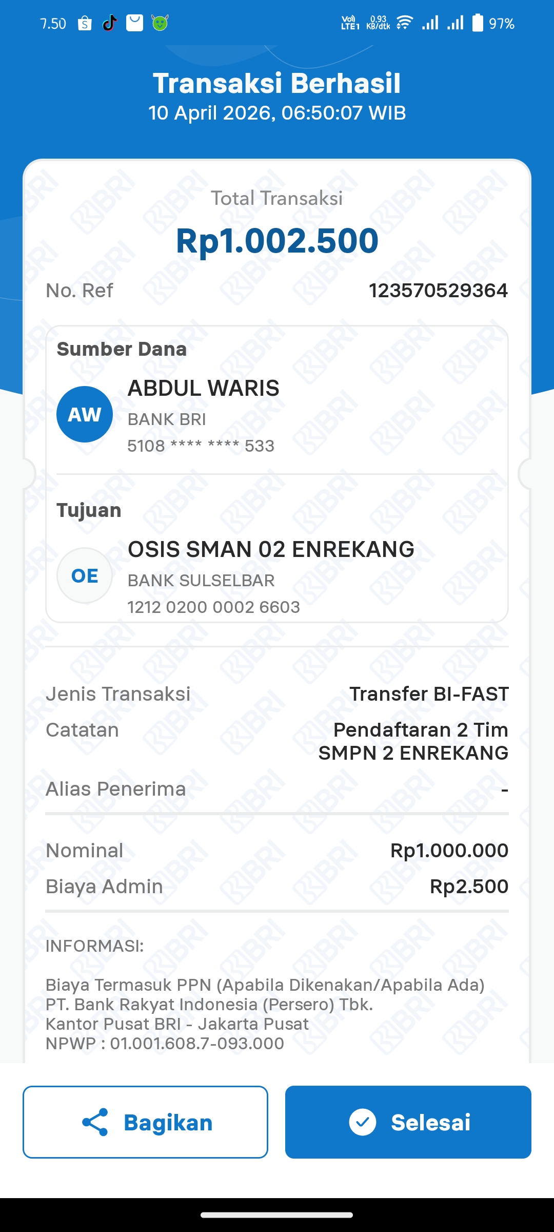 | 73 | 10-04-2026 | Pembayaran pendaftaran futsal | - | Rp 1.000.000 | Rp 486.490 | |
