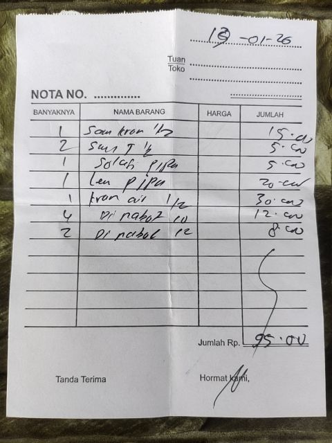 - Beli Sambungan Kerang 1/2 - Beli Sambungan T 1/2 - Beli Solasi Pipa - Beli Lem Pipa - Beli Kran Air 1/2 - Beli Dinabol 10 - Beli Dinabol 12 |