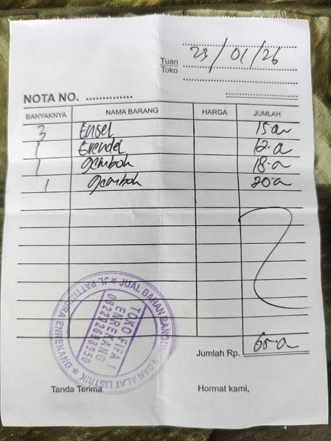 | 24 | 28-01-2026 | Beli Grandel | - | Rp 12.000 | Rp -65.593 | |